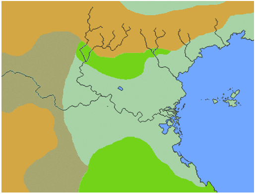 Key to the question of figuring out where these two should go, is the fact that Erhadzy is situated a million miles away and we need a plausible way for it to get there. If I'm reading Zhen Lin's description correctly, then we need to arrange for Yhát to be spoken on the eastern coast somewhere below the Eige delta. Complicating this question is the fact that Naidda, Puoni, and Gezoro, and later their descendents, are already in that area. (Perhaps Gezoro has died out by that time, however. Or not.) So Yhát should probably be not too far north - the far SE peninsula looks appropriate.